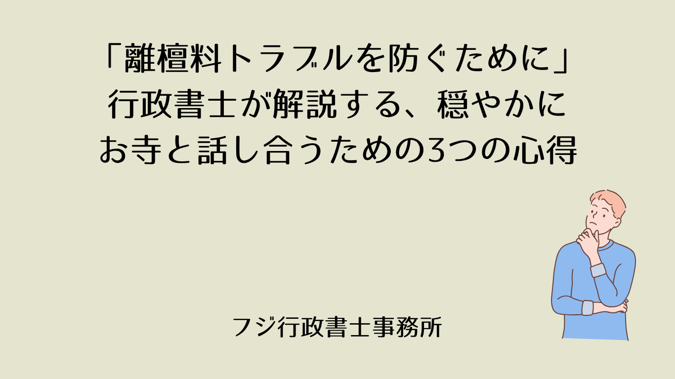 離檀に伴うトラブルの多くは、この“伝え方”の問題から生まれます。「突然通知された」「一方的に業者を通じて連絡された」「法要の支払いが未納のままだった」――こうした事例は、寺院側に不信感を与え、離檀料の金額が不当に高額になる原因にもなりかねません。感情的な行き違いを防ぐには、手続きの流れを整理し、必要に応じて専門家の助言を受けながら進めることが、実は最も穏やかな方法です。